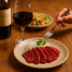 霜降り馬刺しには、少し重めの赤ワインを合わせると脂の旨味とタンニンの渋みが調和し、深い味わいが楽しめます。