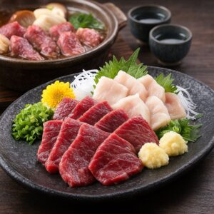 馬刺し盛り合わせでは赤身・霜降り・希少部位が美しく盛り付けられ、初めての人でも違いを楽しめるよう工夫されています。